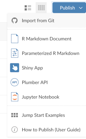 If you are using the RStudio IDE, there is also support for push-button publishing to Posit Connect. Use the publish button from the source editor or viewer pane to publish a document or a website: