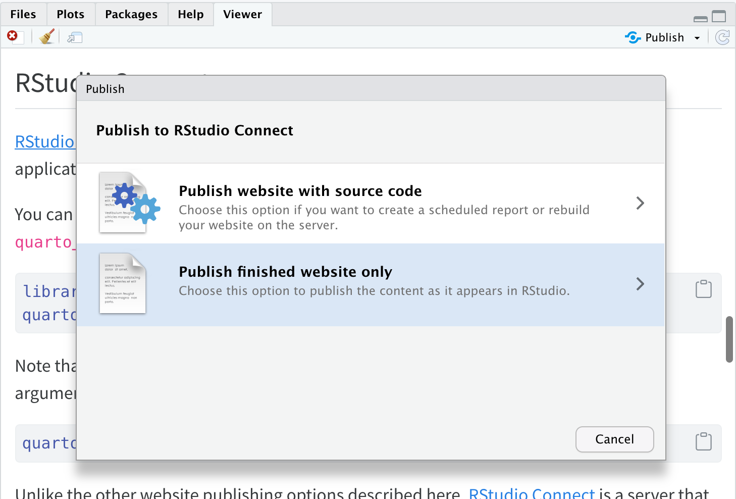 The tools for publishing code differ depending on whether you are using the Knitr (R) or Jupyter (Python) engine, so we’ll cover them separately below. Note that Quarto must be installed on the Connect server before you attempt to publish with code (this is typically done by an administrator, see the Quarto Installation documentation for additional details).